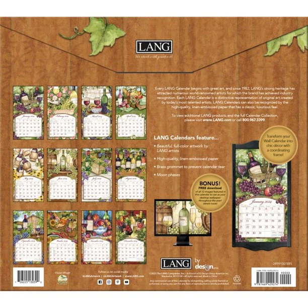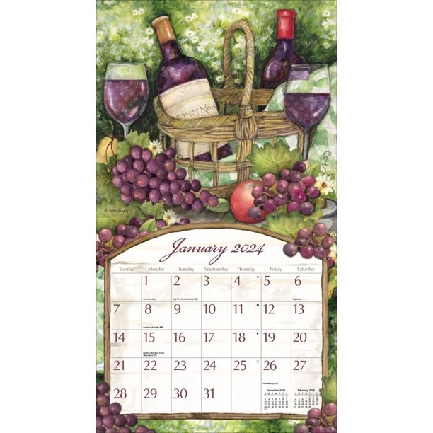 The Wine Country 2024 Wall Calendar is decorated with monthly artwork of staples you’d find at a winery grapes, cheese and plenty of wine glasses fill with your favorite wines by Susan Winget. LANG Wall Calendars feature monthly full color images, elegant linen embossed paper stock, and a brass grommet for hanging.