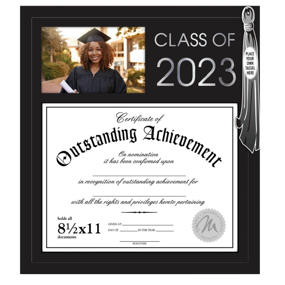 - This decorative frame features the phrase “Class of 2023” screen-printed in silver.