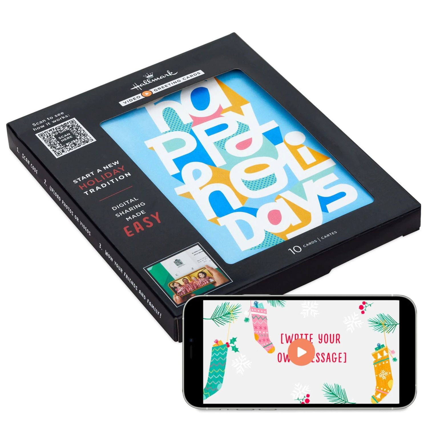 Boxed Video Greeting Cards pack features a collage of colorful shadow lettering on blue. A unique scan code inside lets you easily add a personalized video for all your recipients to enjoy.