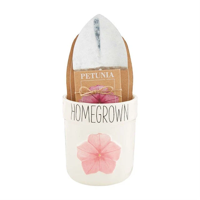 This 3-piece set features a mottled ceramic flower pot with debossed sentiment “Homegrown.” It arrives with a wood handled garden trowel and a kraft Petunia seed packet.
