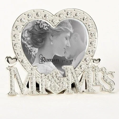 Studded Rhinestone Mr. & Mrs. Heart Picture Frame Holds 3″ X 3″ Photo