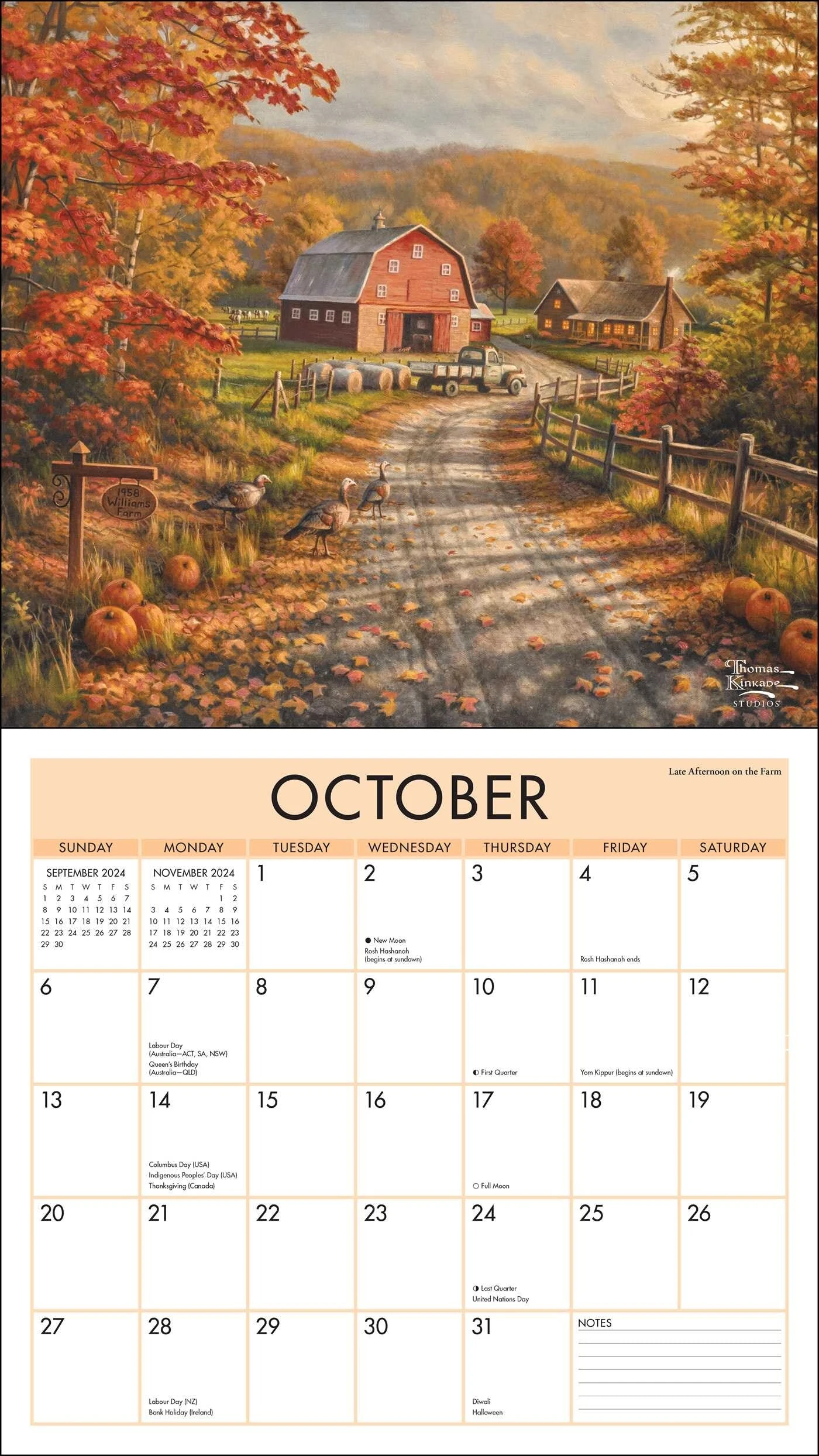 Thomas Kinkade Studios carries on the artist’s legacy of creating and sharing beautiful images that evoke a sense of peace, inspiration, and gratitude, reminding us of home, family, and the places and things that bring us joy. Each monthly spread of this calendar features an image such as RosebudCottage, Sunset on Golden Gate Bridge, and SierraParadise.