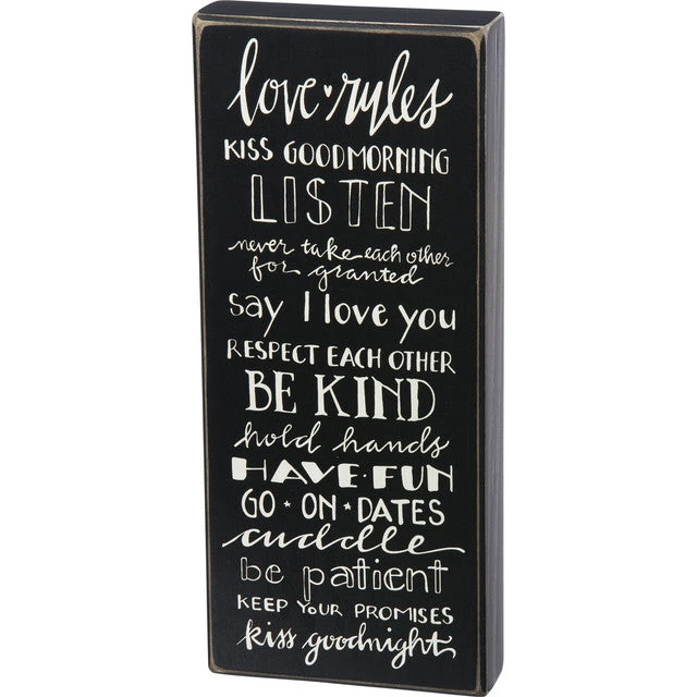 A black and white wooden box sign featuring a hand lettered “Love Rules – Kiss Good Morning – Listen – Never Take Each Other For Granted – Say I Love You – Respect Each Other – Be Kind – Hold Hands – Have Fun – Go On Dates – Cuddle – Be Patient – Keep Your Promises – Kiss Goodnight” sentiment with heart design. Complements well with existing decor or coordinating design pieces. Easy to hang or can free-stand alone.