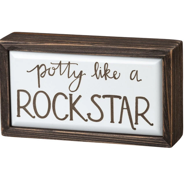 A wooden box sign featuring a “Potty Like A Rock Star” sentiment and tile-like finish. Easy to hang or can free-stand alone. Complements well with other pieces in collection.